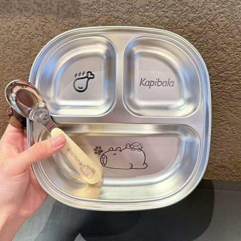 Thiết kế hình Capybara dễ thương giúp tạo hứng thú cho bé khi ăn, và khay thường có nhiều ngăn để chia nhỏ thức ăn.