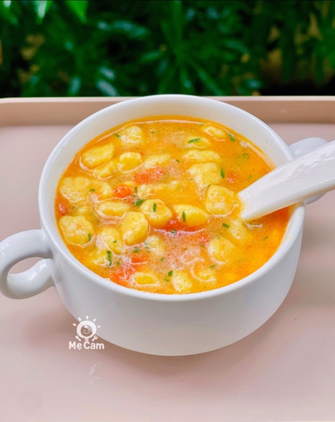 Phần bột đã trộn cho vào túi bắt kem hoặc túi đựng thực phẩm và tạo hình thành viên nhỏ như thế này rồi thả vào nước dùng
