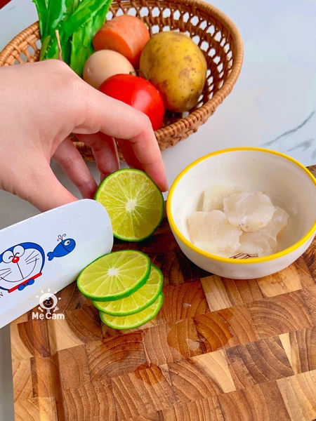 Ở đây mẹ Cam dùng cá, cả nhà có thể thay bằng tôm, bò, heo, gà, cua,... gì cũng được á.