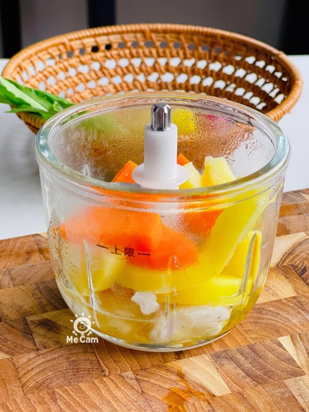 Đem trứng, cá, cà rốt, khoai tây, thêm chút bột nêm rau củ đi xay nhuyễn