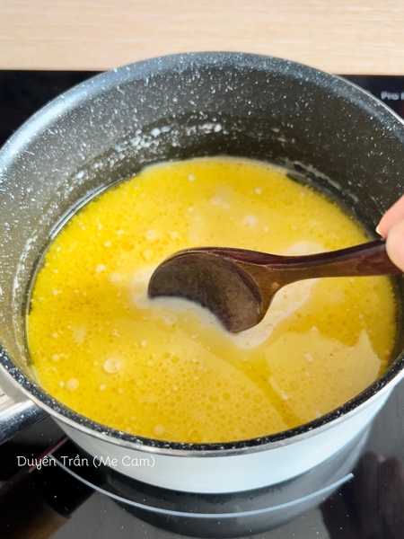 Khuấy thật tan xong bắc nồi lên bếp đun ở lửa nhỏ, ngoáy đều tay.